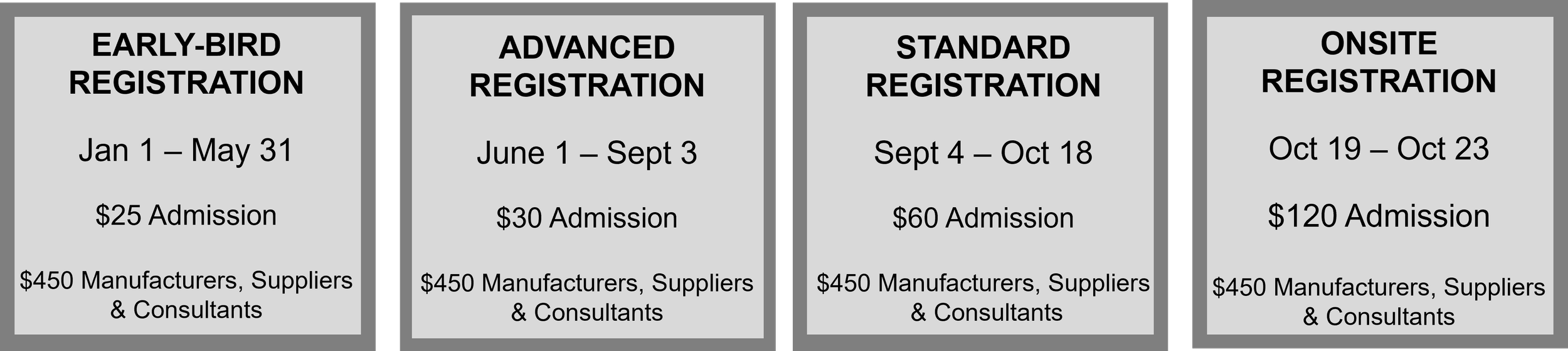 Manufacturer/Supplier/Consultant Registrations: This registration type applies to attendees from companies who manufacture their own product to the industry, supply a direct product or service to the industry, are in media sales, an industry consultant or are a manufacturer’s sales representative.