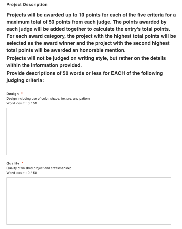 This year, each judging criterion has been separated within the application so you can address them individually. This mirrors the judges’ review process and allows you to call out specific strengths for each category.